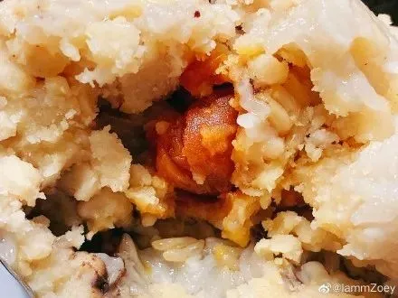 用筷子扒开就可以看到非常丰富的馅料,咸鸭鸡蛋、冬瓜蓉、五花肉、栗子、冬菇,吃起来却没有厚重的辛辣感,蛋香糯香肉香豆香混合在一起,令人回味无穷。