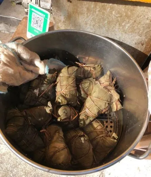 肥姨十多年前就开始卖粽,靠张小椅子、几个槽子、娴熟的技艺,就将一个个粽子包好,然后放进罐子里面,用电磁炉透火煮。