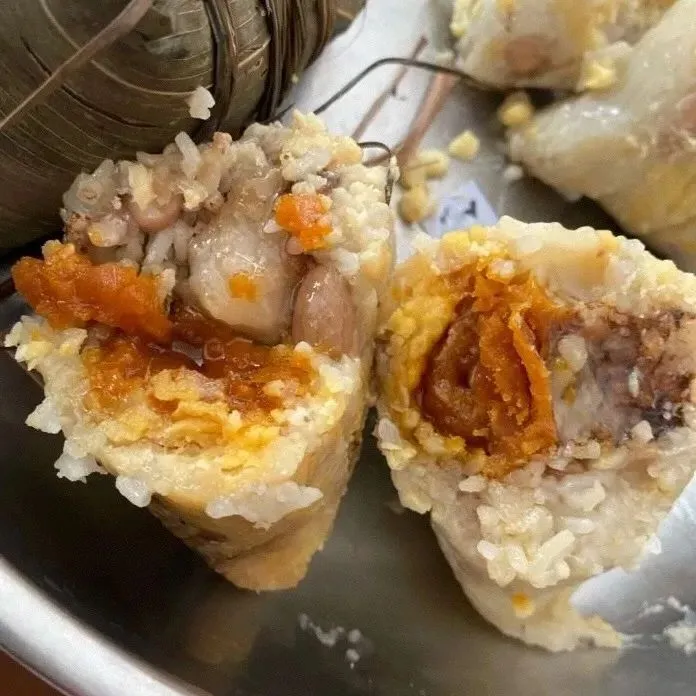 看板的现代鸡蛋叉烧粽,最能吃得出师傅的技艺。粽子里有泡果肉块、黄瓜、冬瓜和栗子...踏实的老板坚持用二号快餐厅做内馅,因此这里粽子的肉片总比Capendu的辐花。