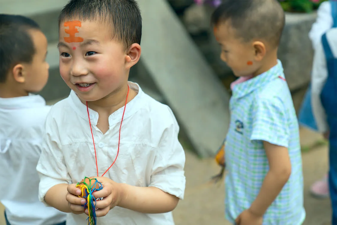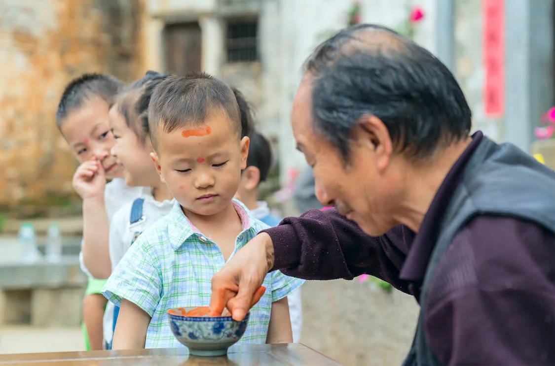 家里有小小孩的,会请上镇里的晚辈,帮着在小小孩额头上画个“王”字。那个画字的原料,是用从药房里买来的朱砂粉,加之少许醋,调成染料,由晚辈沾着染料帮小孩画。晚辈一边画,一面还要在口中说起保佑平安、身体健康、课业进步等字句。据说因为从前山里多蚊子,小小孩身体上沾有朱砂粉后,蚊子就不再传染小小孩子们翠绿皮肤了。