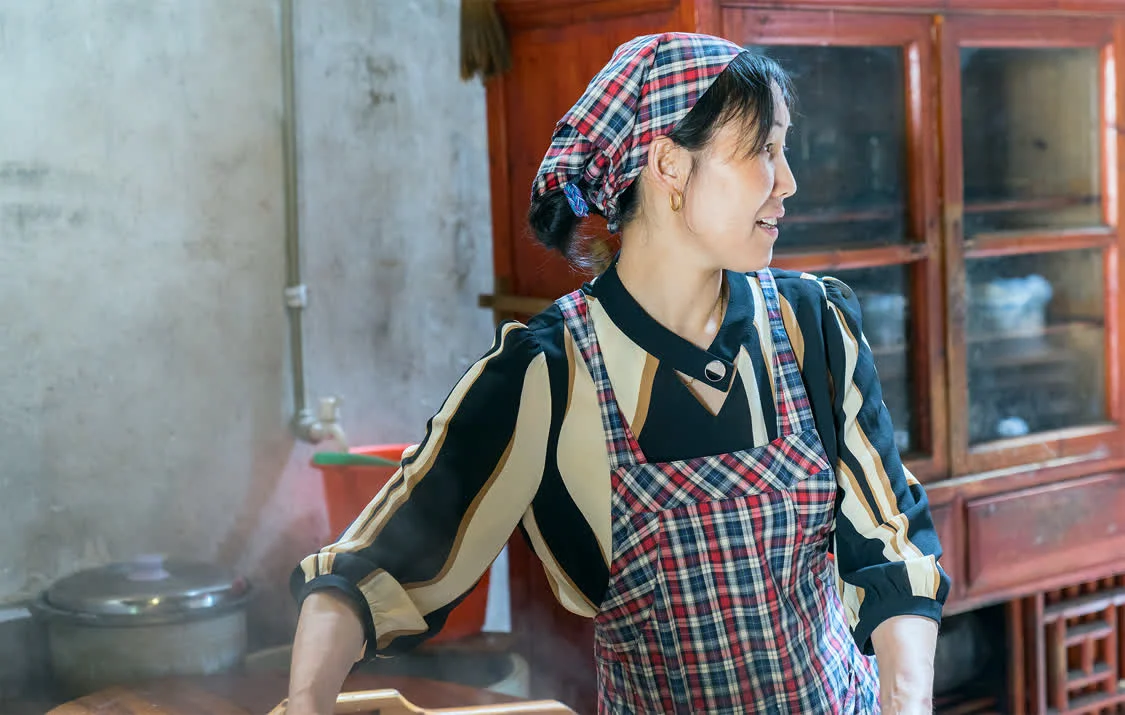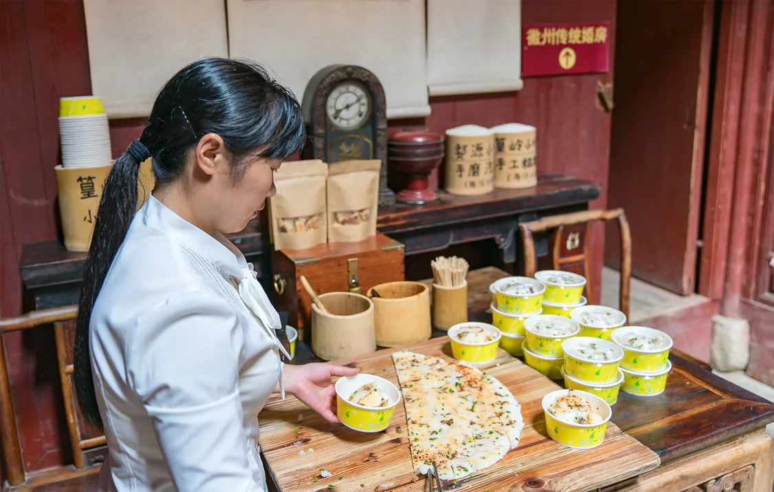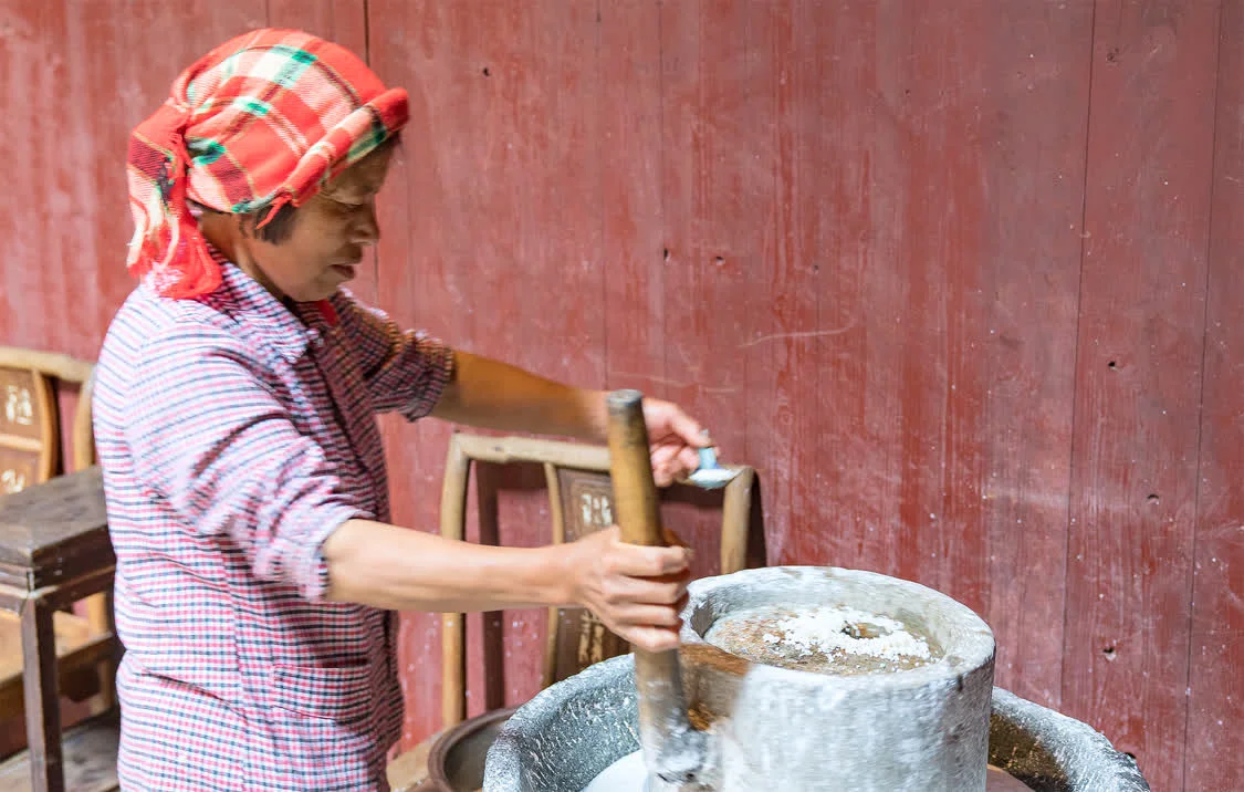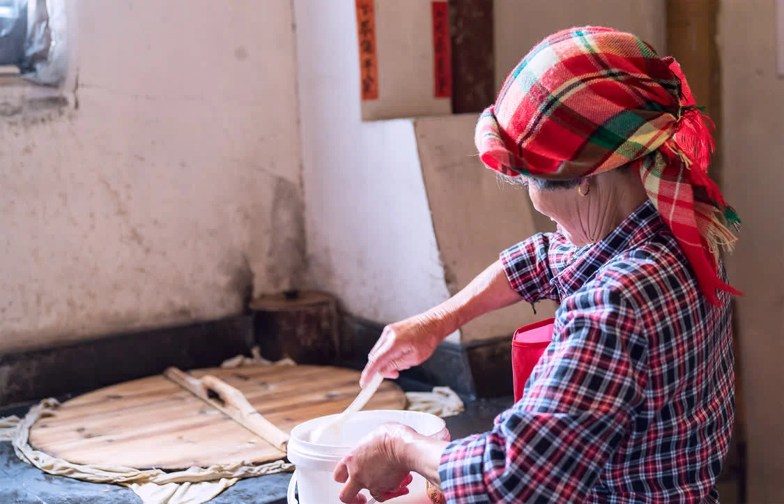 篁岭的大妈们,先要将米洗净并浸泡,然后上磨盘将米磨成米浆,再将米浆放到柴火灶上用猛火蒸。为了让汽糕有口味,蒸的时候还会加入佐料,比如盐、豆腐干丁、笋丁、葱花、辣椒等。大约蒸十来分钟,等一大圆盘的汽糕出炉后,切汽糕,也算一门技术活。
