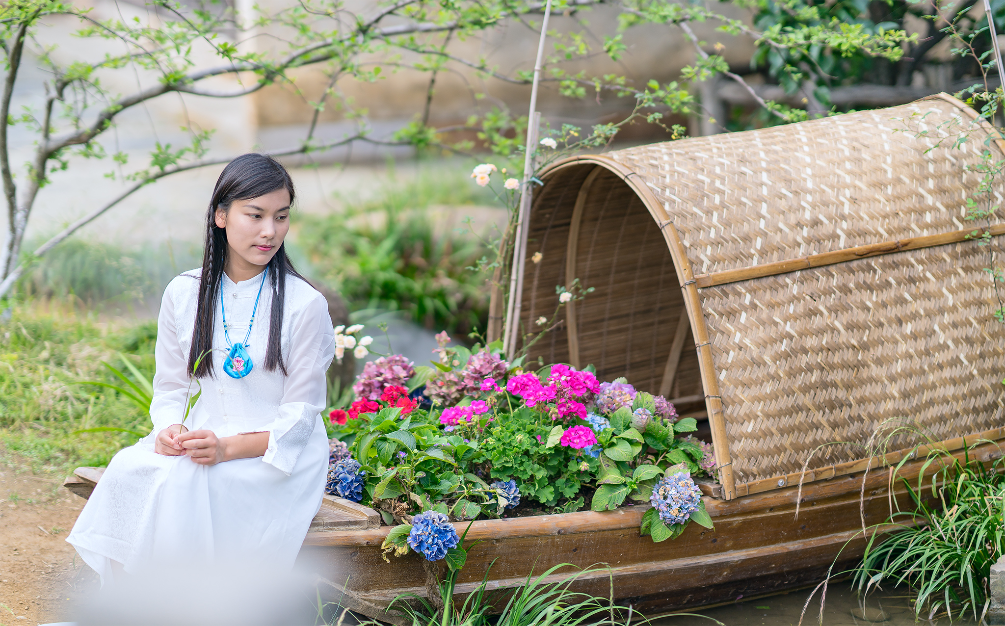 篁岭的蟠桃,也是徽州女人吐露情感的日子。通常在蟠桃来临前的几天里,心灵手巧的篁岭女人们,便会在家中,打开针线包,用丝线织成一只漂亮的缨络,里头放上一棵圆形的大蒜,再用彩绸缝制成生肖香袋,装饰上流苏,中间还放入艾草,挂在胸前,称为端午锦,据说可以远避瘟病。