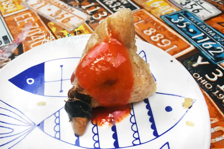 热热的肉粽,淋上甜辣酱非常漂亮: