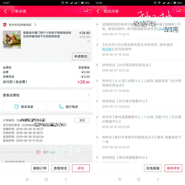 诸老大粽子传承自嘉湖细点的江南风味,历经百年,为瘦长四角枕形,对包制手法有特殊要求,包出来的粽子蒸煮受热均匀、口感细腻、咬劲一致,诸老大独特的手工洗沙红豆沙和粘毛五花肉配方是粽子行业独一无二的,肉粽口口有肉,鲜香糯美,甜粽甜而爽口,糯而不烂,余香满口,在嘉湖沪杭地区享有盛名。饱记粽子需要提前预定,现做现发,5月27日晚上付款下单,售后客服表示这个批次大约6月4日至5日之间发货,我还是等待了好几天的,最后是6月4日中午发货: