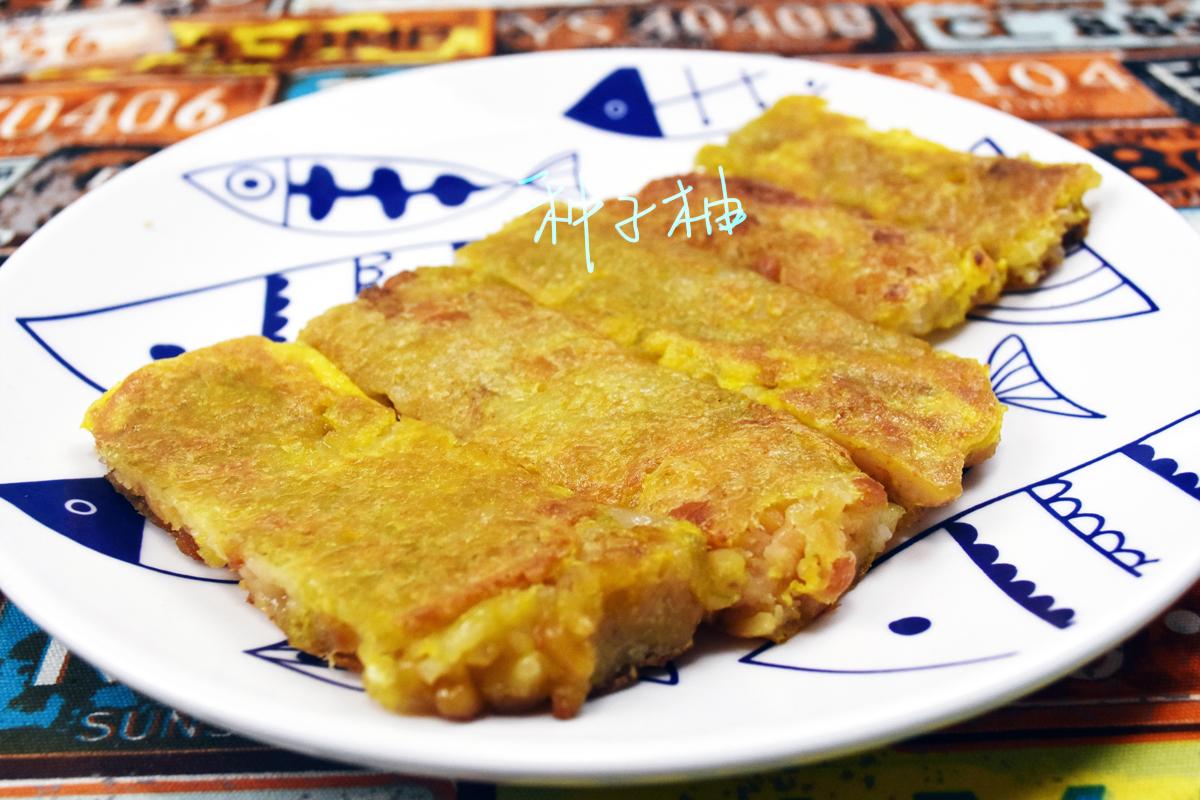 鸡蛋打散,把切片以后的粽子放进蛋液,涂抹均匀,放在平底锅煎至两面金黄,盛出装盘: