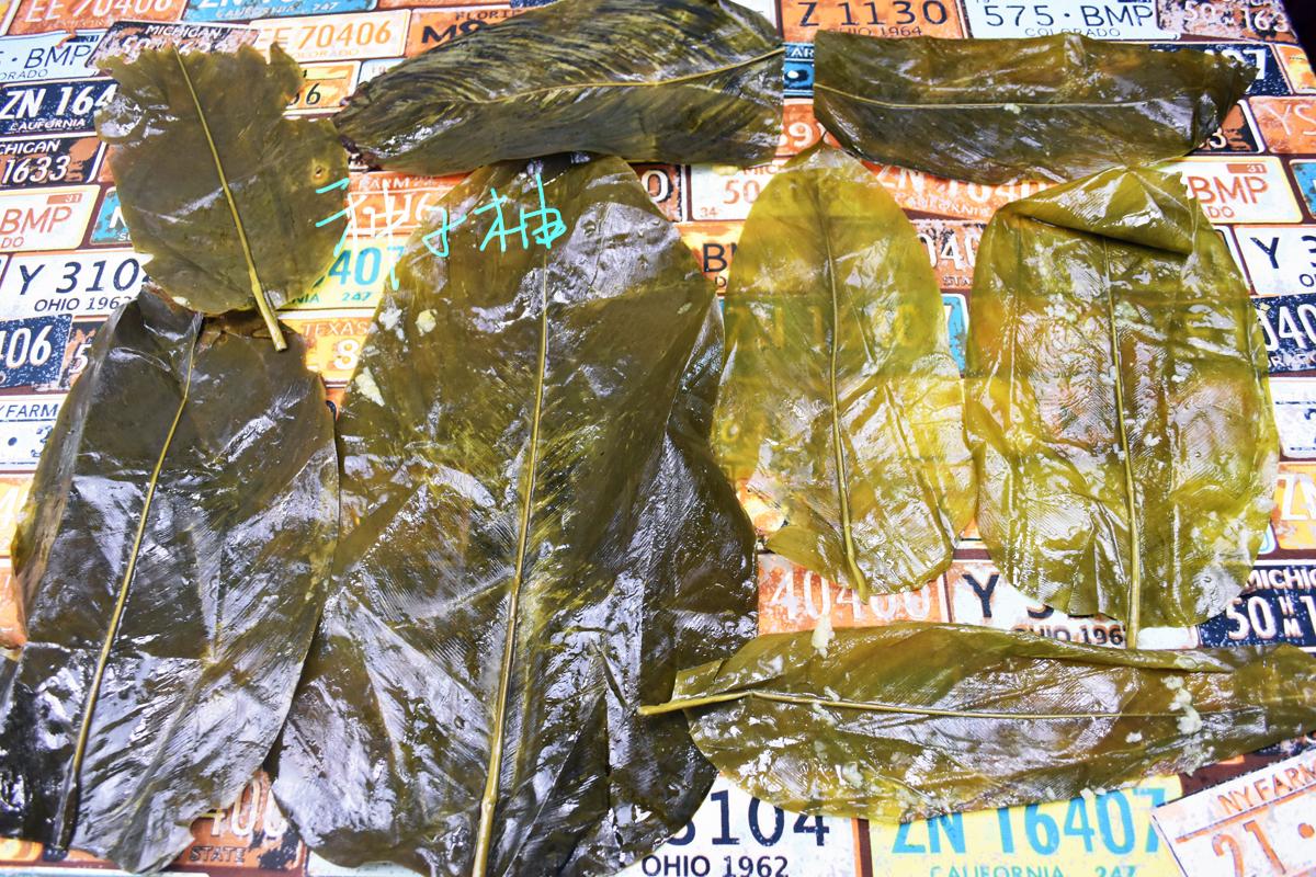 肉片,到底是裹蒸粽,层层包裹,裹蒸粽使用的粽叶是柊叶,每个粽子用了8片粽叶,异常壮观: