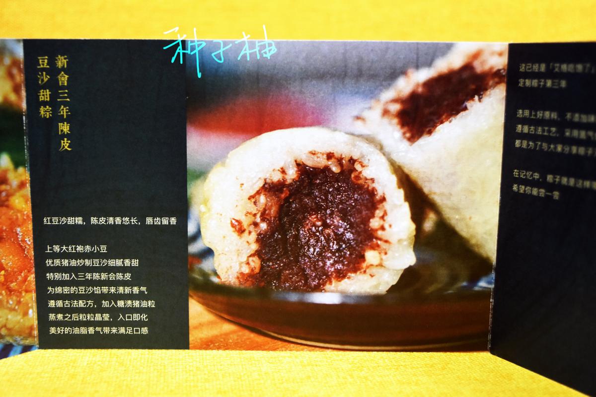 我们平常饮广式糖水的时候,最寻常的搭配就是香草海带绿豆沙、陈皮红豆沙,饱记粽子应该是借鉴了类似的做法,陈皮磨粉,有丝香味、有丝苦味、有丝醇厚味,这竟然不是一款严格意义上的甜粽。