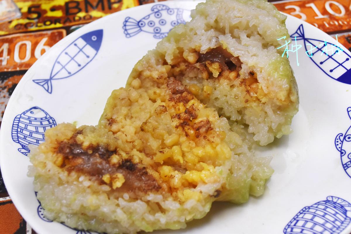 分解整个粽子,看看多样的材料,两块很大的瘦肉、一块肥油、两个流沙咸蛋黄。