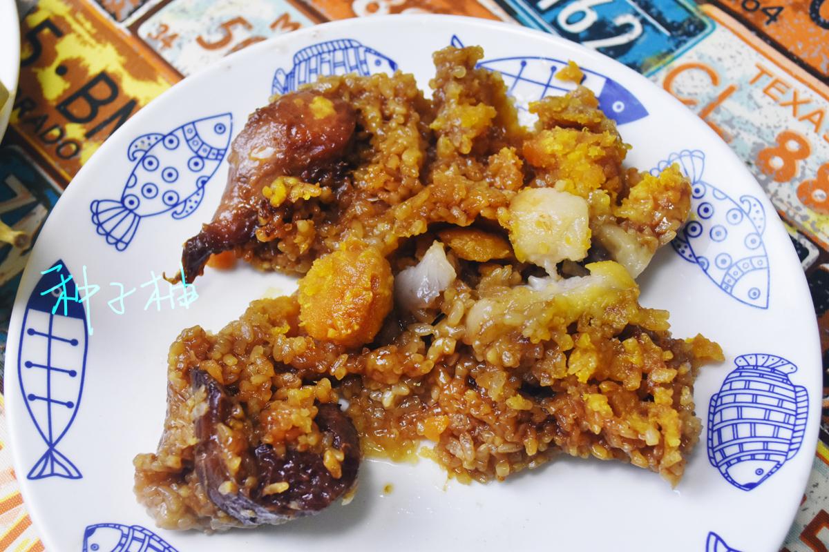 3. 将裹蒸(粽子)切成片状放在三鸟类的肚子里,并缝好,煲或炖一小时左右,风味独特。