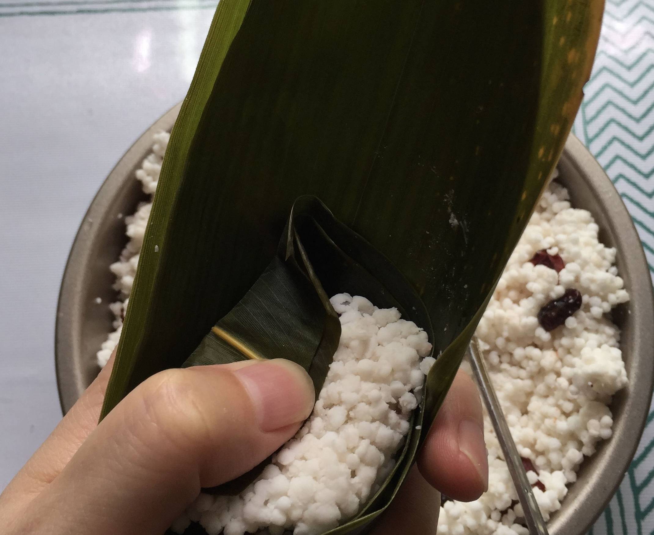 2:粽子的花纹多样,有三角,四角,长方形等等,按自已的手法包好,不漏馅方可。