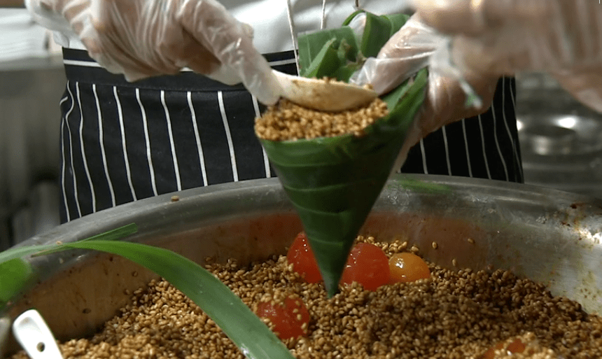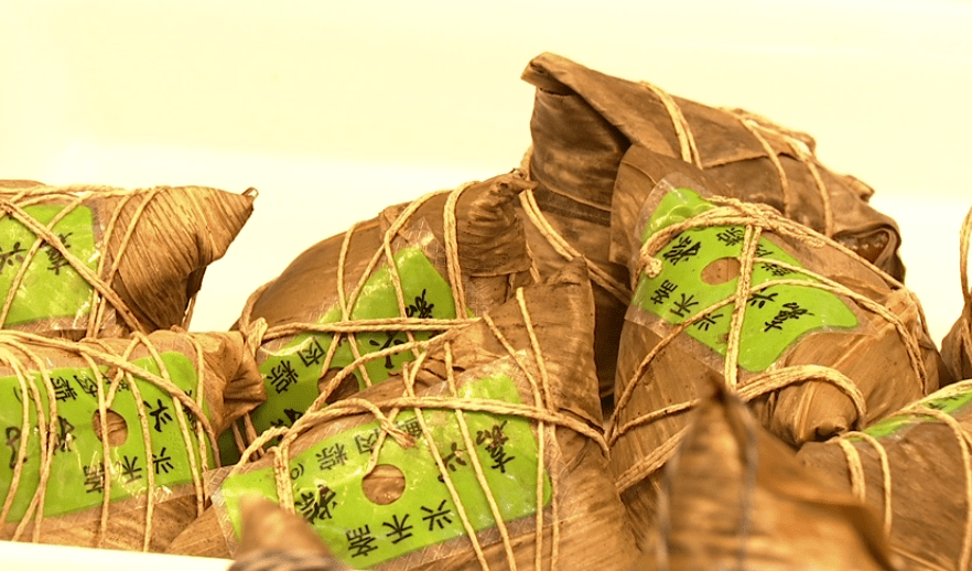 “肉粽和鸡蛋肉粽是他们店门口的销售量王,这个肉要经过一天一夜的腌,才能更爽口。他们还出了这款冰粽,冰粽菜色偏平民化一点,有辣椒、黑巧、土豆、菠萝五彩缤纷。”宽容楼现代纯手工房经理张豆介绍。
