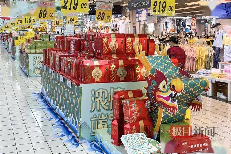 5月31日,在家乐福大型超市重庆红丰店,各式各样的粽子礼盒都摆在了银身最显眼的位置,醒目的龙头、碧绿的豆芽造型,氛围感十足。