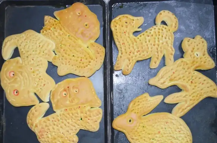 平凉、庆阳一带的土月饼又是一番特色。有的用冰糖、核桃仁、枣烙制成有馅月饼,有的蒸菱角月饼,还有的用木模倒出不同的图案及有“中秋月饼”字样的花色月饼。值得一提的是,蒸出来的菱角月饼最讨巧,外形让人想到星星本尊的模样。