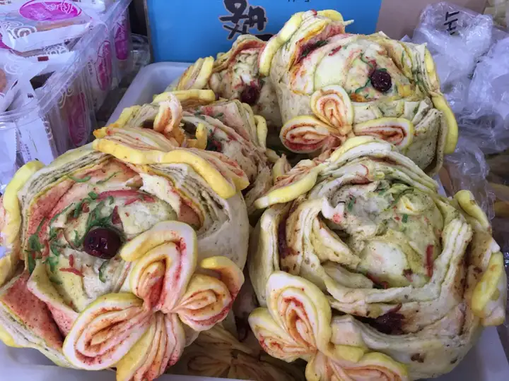 而到了福昌,月饼几乎变成了一个五色的佛塔,黑白相间零落盆般大小、厚厚的圆形面糊,里面由一点一点薄薄的面糊竹节起来,每一层都抹着不同的酱汁,然后放在火上煮熟,说到它的香味,就一个字——“香”!